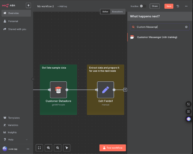 現在我們來修改一下工作流程,跟著官網的範例來加入一個新的節點:Customer Messenger。