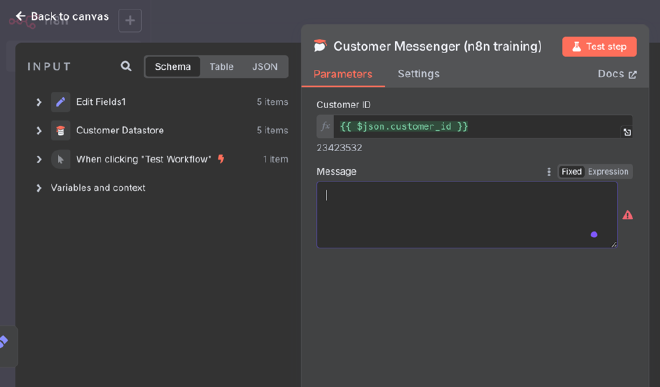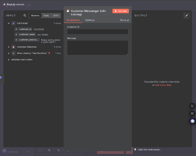 Customer Messenger的內容。左側input面板中的Schematab會載入前面節點的輸出資料。