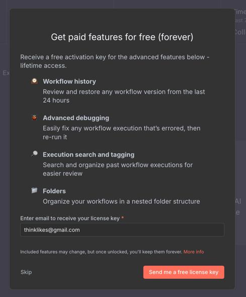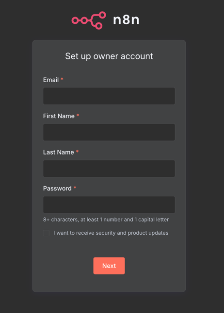 當你第一次進入n8n的工作介面時,系統會要求建立一個 Owner account,這個帳號會是你在使用n8n時的管理者帳號。