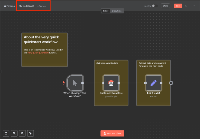 右上角紅框處可以為工作流程改名稱,Add tag則可以為工作流程設置標籤,以便快速搜尋。