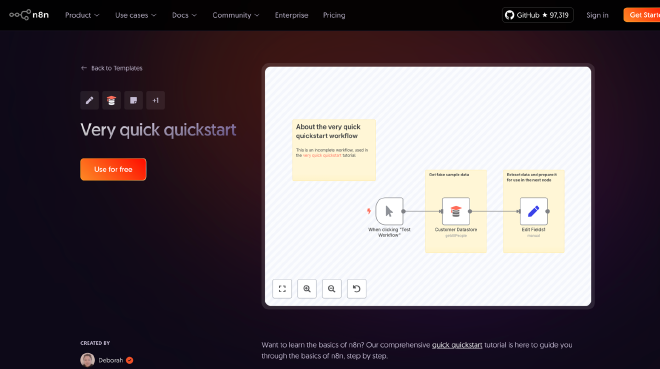 我們先從n8n官方的樣版庫找到quickstart模板,然後 在網頁中點擊左側的
