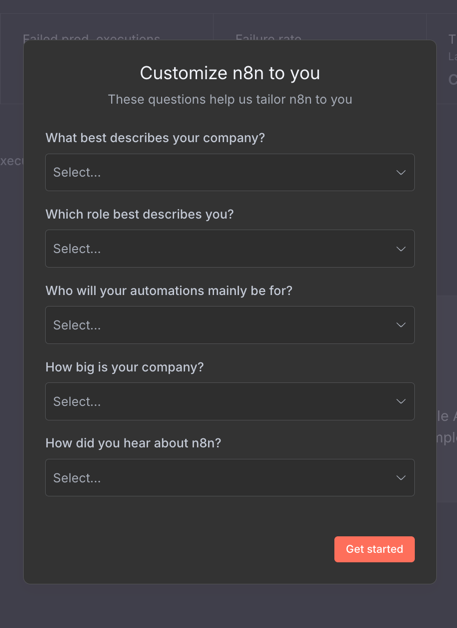接著可以忽略調查n8n的問卷,直接點擊Get Started即可。