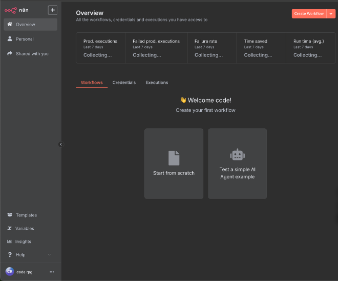 當你完成上述的步驟後,就可以進入n8n的工作介面了。